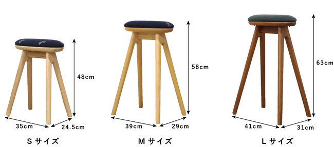 サイズは3サイズからお選びいただけます。使用シーンや身長によってサイズをお選びください。おススメはデスクやダイニングはH48cm、カウンターは58cm、キッチンはH63cmです。