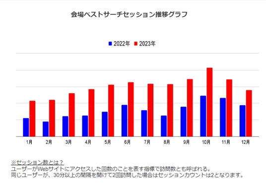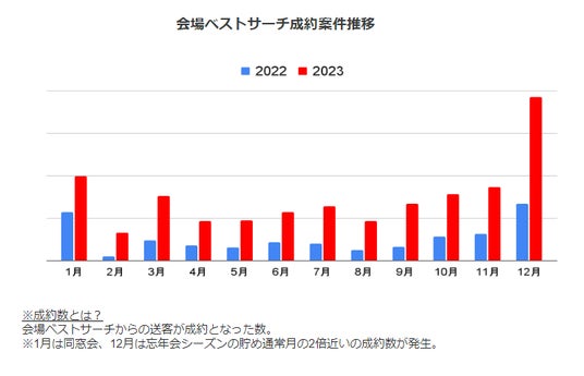 2023年の会場ベストサーチのセッション数(訪問数)は、2022年対比190%、送客件数は2022年対比240%と大幅増加。サイトそのものの成長に加え、宴会需要が回復。 会場ベストサーチを通して多くの利用者と会場がマッチングした1年となりました。