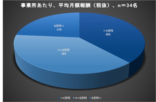 嘱託産業医の顧問先あたり平均月額報酬に関するアンケート(有効回答数=34名)では、月額4万円以下が約4割となりました。
