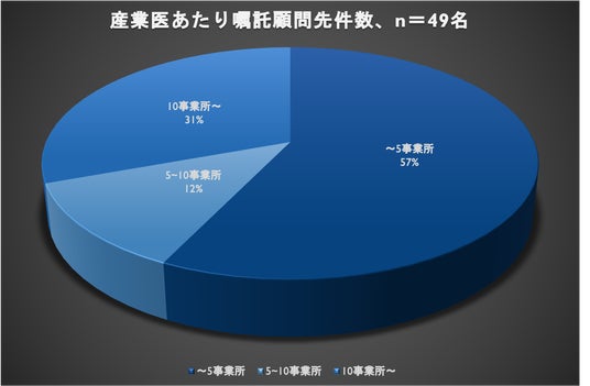 嘱託産業医の平均顧問先数に関するアンケート(有効回答数=49名)では、約6割の産業医が顧問先5事業所以下となっていました。