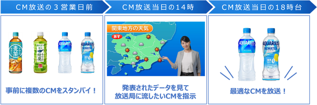 今回の日本コカ・コーラ社の事例では、事前に「アクエリアス」と「アクエリアス NEWATER(ニューウォーター)」、「やかんの麦茶 from 爽健美茶」、「綾鷹」、4種のCMをスタンバイ。放送日当日に発表される天気予報に合わせ、番組内で放送するCMを選択します。放送直前の状況にあわせて臨機応変に商材がえらべるので、視聴者の体感に寄りそったテレビ広告が実現できます。