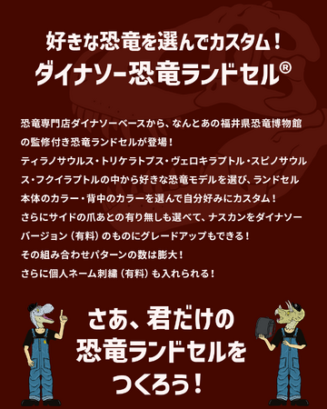 恐竜ランドセルなら「恐竜専門店ダイナソーベース」と言われる中でも圧倒的人気が福井県立恐竜博物館に監修していただいた 「カスタムオーダー 恐竜ランドセル(R)︎」