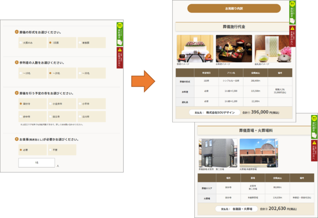 カンタン見積シミュレーションのページから、1.葬儀の形式、2.参列者の人数、3.葬儀を行うエリア、4.お食事の要・不要、5.返礼品の要・不要、を入力すると、祭壇や料理、返礼品のイメージ画像や、利用する葬儀式場や火葬場候補の情報が表示され、お葬式にかかる総額(概算)を確認することができます。