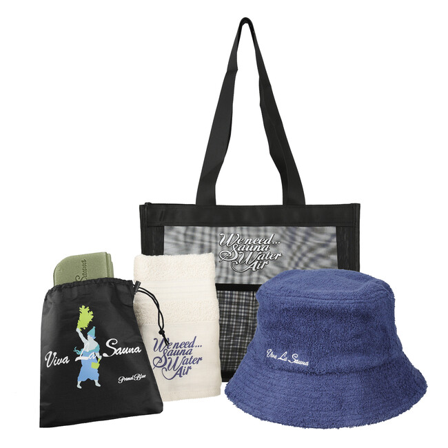 サウナハット、サウナマット、タオル、メッシュトートバッグの4点がセットになったサウナ入門キットです。