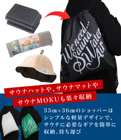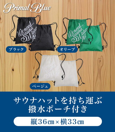 PrimalBlueの「Weneed…SaunaWaterAir」のロゴが入ったサウナハットと同色のドローコードバッグがあれば333cm×36cmの大きさでサウナハットはもちろん、サウナマットやサウナMOKUタオルなども一緒に収納。