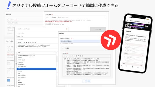 オリジナル投稿フォームを、コンテストやオーディションに応じて、テキストやラジオボタン、プルダウンなどを入力項目を自由に設定でき、簡単に作成することができます。
