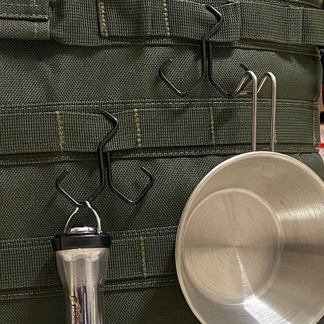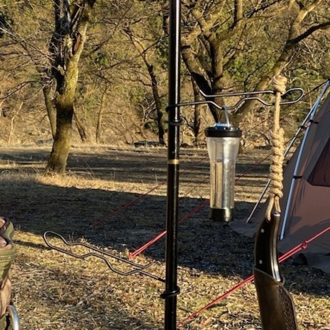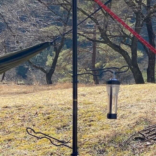 クリップ状になっているのでぐらつくことなく生地にフィットします。他にも幕内やタープ下のガイロープに簡単に掛けられるので、ランタンや小物を吊るすのにも非常に適しており、左右の移動もラクチンです。あらゆるシーンで使えるギアとなっています。