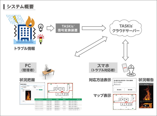 地震や水害、工場内の重要設備故障など、あらゆる緊急事態発生時にそれらを検知した異常信号(接点信号)をTASKisシステムで受信できるようにした