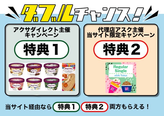 インターネットからの新規ご成約で「ローソン【お持ち帰り限定】ハーゲンダッツ対象 7 種いずれか 1 つ (税込 351 円)無料引換券×2個」+「サーティワン アイスクリーム レギュラーシングルギフト券1枚」をもれなくプレゼントいたします。