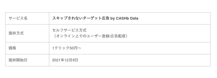 ビックデータを活用して新たな価値を提供するキャッシュビーデータ株式会社(本社:東京都港区、代表取締役:安藤 秀之、以下CBD)は、生活者・購買データを活用した新しいターゲット広告サービス「スキップされないターゲット広告 by CASHb Data」を2021年12月9日に提供を開始します。