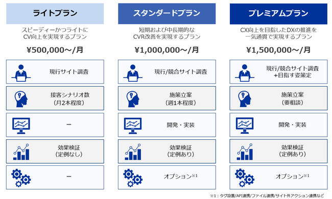 短期的にコンバージョン率の改善をお考えのお客様から、CX(顧客体験)の向上を実現することで、競合他社との差別化を図りたいとお考えのお客様まで、それぞれの目的に応じたご利用が可能です。
