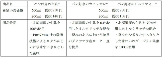 *2. ベルギー・Pur Natur (ピュアナチュール)社の独自技術を基にした殺菌方法により、生乳本来のコクはそのままにすっきりした後味を実現した乳飲料。『パン好きの牛乳(R)』『パン好きのカフェオレ(R)』『パン好きのミルクティー(R)』を展開。