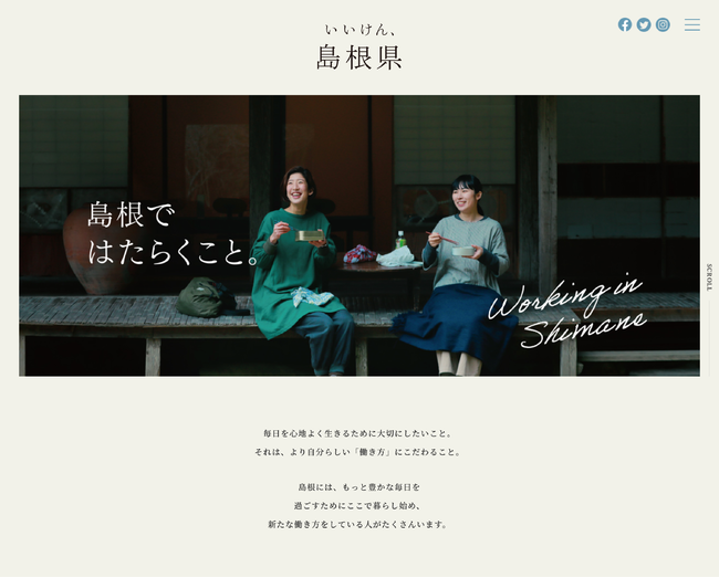 2022年秋から、「島根ではたらくこと」を新テーマにしたコンテンツを公開します。都会で得られるものとは違った“幸福感”や“満足感”をキーメッセージとして伝えていきます。実際に島根県に移住し、働いている人たちの『島根だから良かった。島根で良かった』といったリアルな声や価値観をお届けし、やりがいを感じながら働いている様子、多様な価値観を受け入れてくれている寛容な企業風土、心豊かな生活ぶりを紹介していきます。