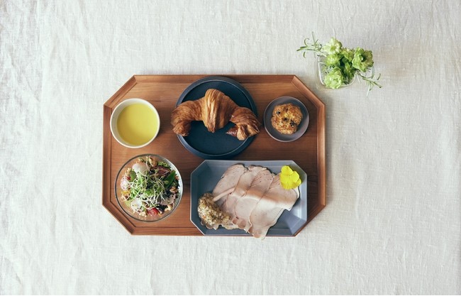 店舗 2 階では、一番人気のクロワッサンの食べ方を体験してもらうため、健康を意識したプレートラ ンチを開発しました。人気 1 位 Merci クロワッサンをメインに、人気 2 位の有機くるみ&チョコチップ スコーン、血糖値上昇を抑える食物繊維豊富な 9 種類のサラダ、上質なタンパク質が摂取でき、低カロ リーのローストポーク、口当たりなめらかなパンプキンスープをお楽しみいただけます。北海道産バタ ーを使用したバターロール食べ放題付きで、食べ応えのあるプレートランチです。