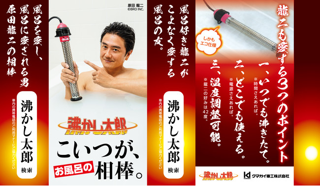自称芸能界一のお風呂好きタレントとしてテレビやYouTubeなどで大活躍する原田龍二さんが、ヒートテクノロジーの分野で高く評価されているクマガイ電工株式会社(本社所在地:大阪府八尾市、代表:熊谷康正)の湯沸かしヒーター【沸かし太郎】とタイアップ!このたび、原田さんと「沸かし太郎」のタイアップ広告、1年間の京都市営地下鉄つり革ジャックが実現しました。