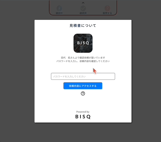 メールに記載のURLやQRコードからBISQにアクセスし、依頼者から送付された内容を閲覧 ファイルの添付や依頼者への質問をBISQ上で行う