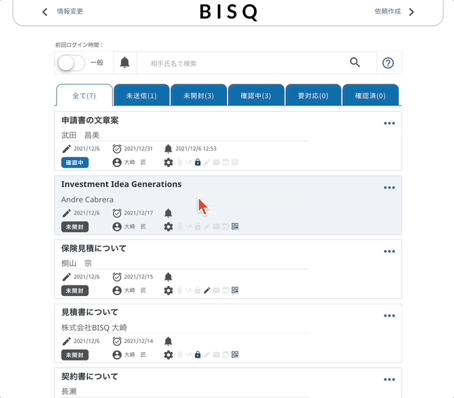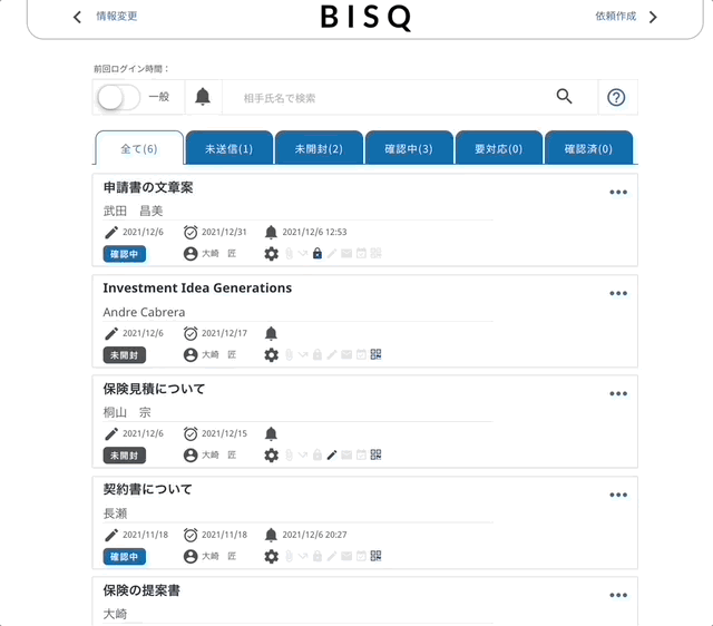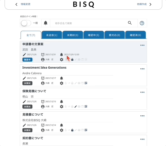 依頼を送信後、状況を一括して確認。必要に応じてリマインダーや相手からの質問にBISQ上で回答