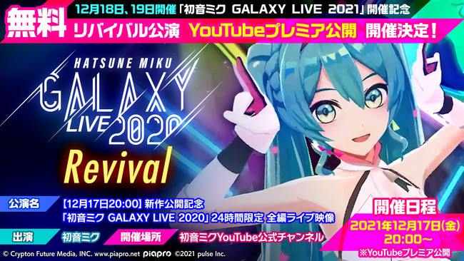日頃ご愛顧いただいている皆さまへの御礼といたしまして、 2021年12月18日(土)、19日(日)開催の「初音ミク GALAXY LIVE 2021」に先駆け、 昨年開催した「初音ミク GALAXY LIVE 2020」のリバイバル公演を無料開催いたします!
