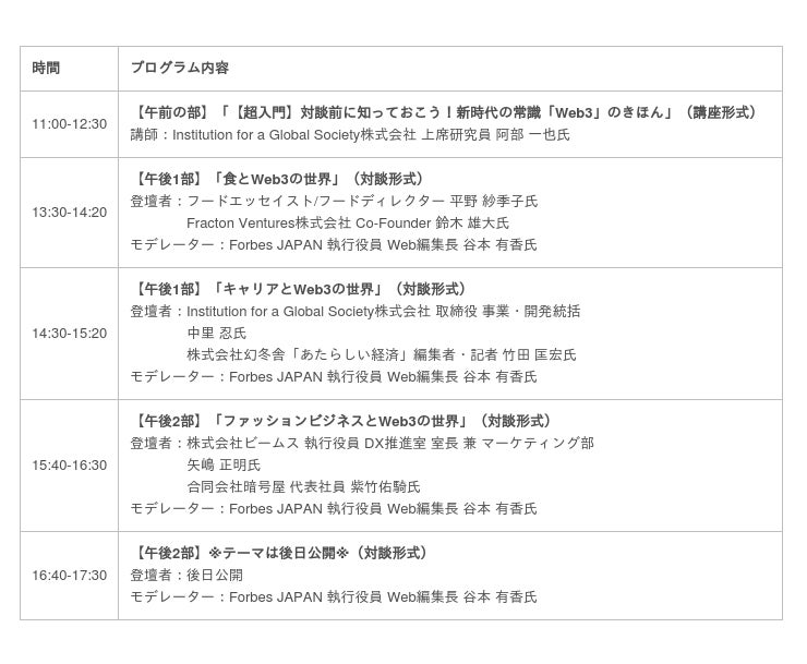 各界の専門家とWeb3専門家をつなぐモデレーターは、Forbes JAPAN 執行役員 Web編集長 谷本有香氏。各界の専門家は、フードエッセイスト/フードディレクター 平野紗季子氏、株式会社ビームス 執行役員 DX推進室 室長 兼 マーケティング部 矢嶋正明氏、Institution for a Global Society株式会社 取締役 事業・開発統括 中里忍氏が登壇。Web3専門家は、Web3のフロントランナーである、Fracton Ventures株式会社 Co-Founder 鈴木雄大氏、株式会社幻冬舎「あたらしい経済」編集者・記者 竹田匡宏氏、合同会社暗号屋 代表社員 紫竹佑騎氏をお招きします。