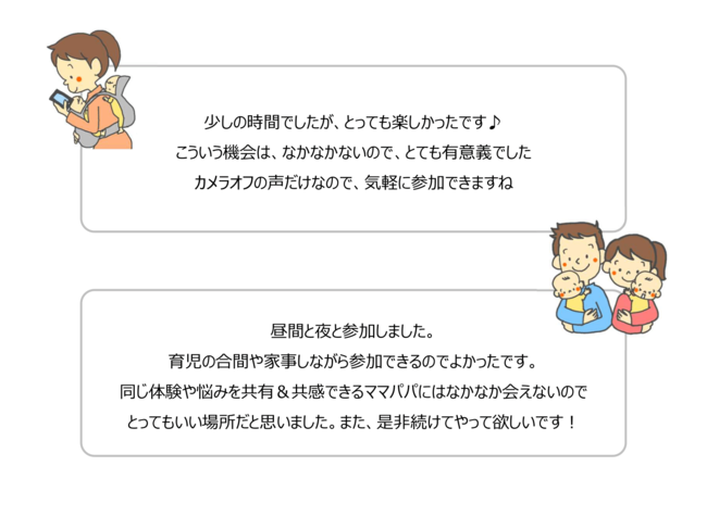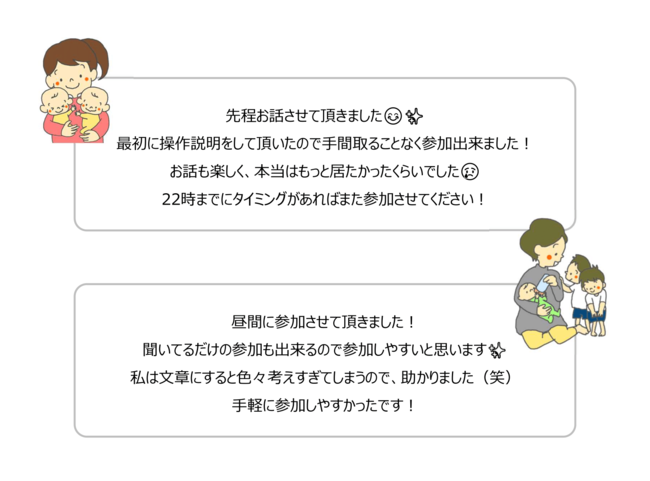 NPO法人つなげるがお届けするオンラインコミュニティに『ふたごのひろば』という新サービスが加わりました。『ふたごのひろば』は、多胎家庭だけが集う場所だから、いつでも安心して話ができます。ワンクリックで参加できて、そばで話をしているように、楽しく雑談できます。あなたも音声で気軽にお話してみませんか?ご参加をお待ちしております。