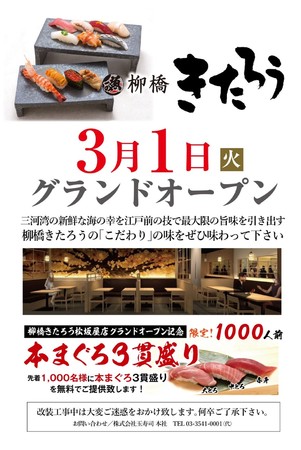 江戸前寿司店を展開している株式会社玉寿司(本社:東京都中央区、代表取締役社長:中野里陽平)は、東海三県の魚河岸の新鮮なネタを使った本格江戸前寿司店『柳橋きたろう』の3号店を、2022年3月1日(火)、松坂屋名古屋店 本館9階にオープンいたします。