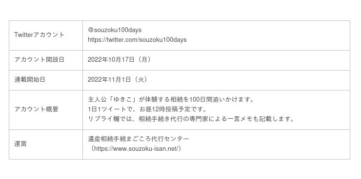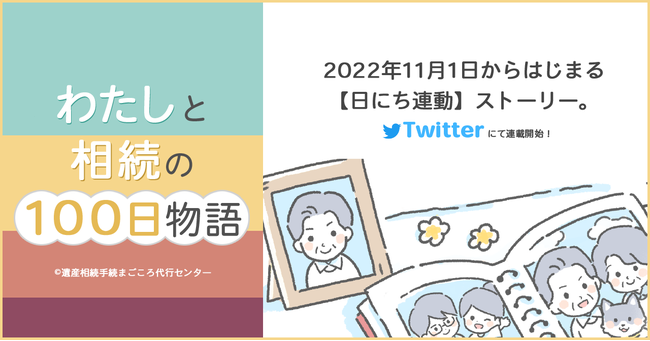 G1行政書士法人が受付窓口と相続事務を担う遺産相続手続まごころ代行センター(東京都千代田区・大阪府大阪市)は、相続発生後のリアルな100日間を描く漫画『わたしと相続の100日物語』をTwitterで連載開始します。実際の2022年11月1日に相続が発生したとして物語は始まり、1日1ツイートで、登場人物たちの相続の様子を100日かけて連載します。