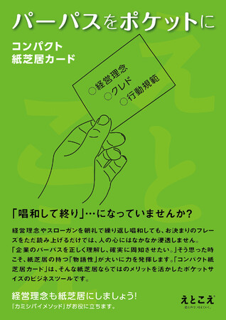 紙芝居は人のこころをつかむ、古くて新しい“ビジネスツール”。紙芝居を創り・演じるための「カミシバイメソッド」は経営理念の浸透に最適なツールです。クレドカードを読むだけではインプットしかできません。紙芝居を演じるように、人に話すというアウトプットをすることで理念を浸透できます。