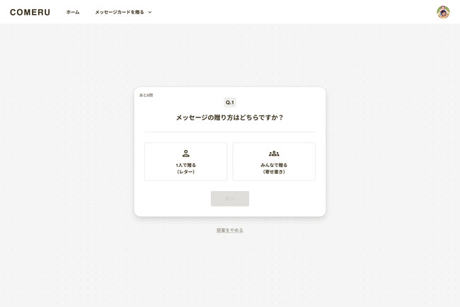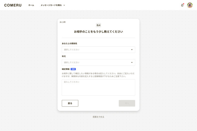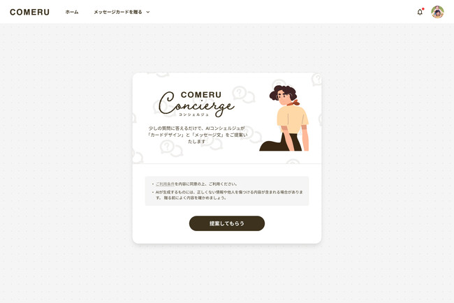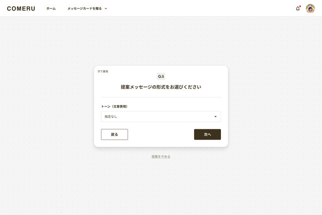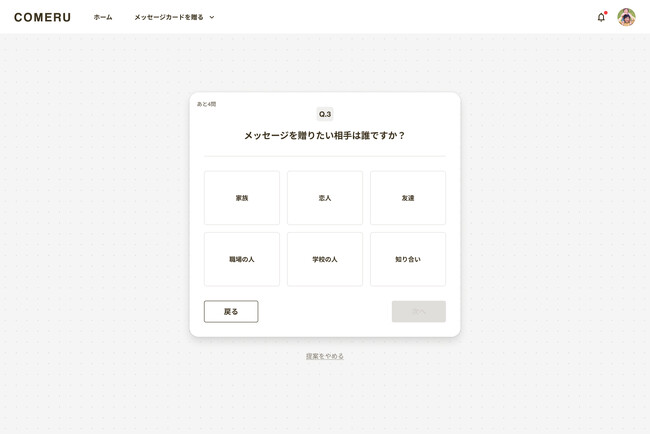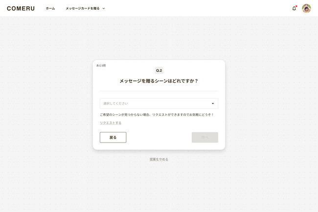 5問程度の簡単な質問に答えて、COMERU Concierge(β)がオススメのカードデザイン・メッセージ文章を提案します。メッセージメッセージの送り方(1人でorみんなで)、メッセージを送るシーン、メッセージを送りたい相手、メッセージの形式(トーン)、自由なリクエストなどの質問です。