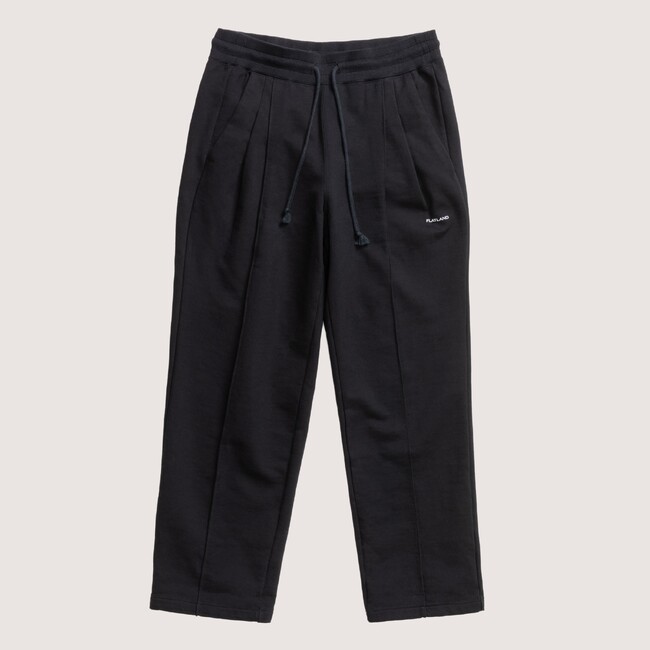 パンツにはあえてスラックスのパターンを採用し、さりげなくテーパードなラインやセンタープレス風に見えるタックなど、カジュアル過ぎないシルエットとエレガントな遊び心がポイント。