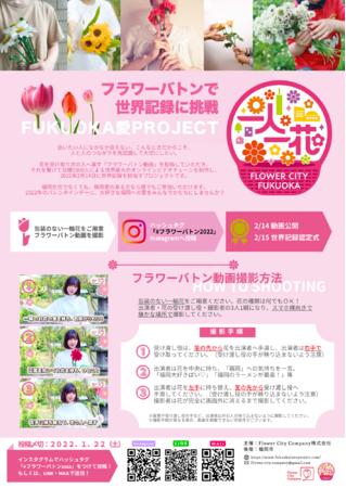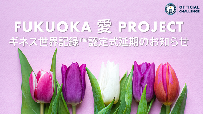 花を受け取り次の人へ渡す「フラワーバトン動画」を公募し、それを繋げて目標1000人による世界最大のオンラインビデオチェーンを制作、ギネス世界記録認定を目指す、福岡市後援・市民参加型プロジェクト「FUKUOKA 愛 PROJECT~2.14 フラワーバトン ギネス世界記録へ挑戦~」。新型コロナウイルスの感染拡大を受けて、2022年2月15日(火)に予定していたギネス世界記録認定式を2022年3月以降に延期することが決定いたしました。