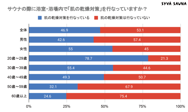 浴室・浴場内での「肌の乾燥対策」を行なっているのは47%で、浴場内での保湿ケアは未だ少数派。