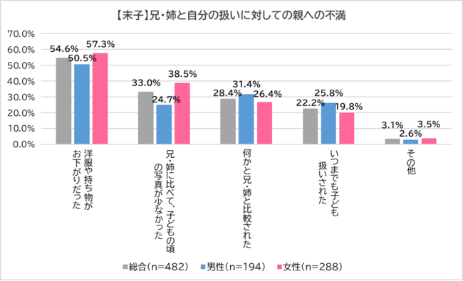 末子にも尋ねたところ、男女共に「洋服や持ち物がお下がりだった」(総合:54.6%、男性:50.5%、女性:57.3%)が最多となり、「兄・姉に比べて、子どもの頃の写真が少なかった」(総合:33.0%、男性:24.7%、女性:38.5%)は男女で差が見られました。