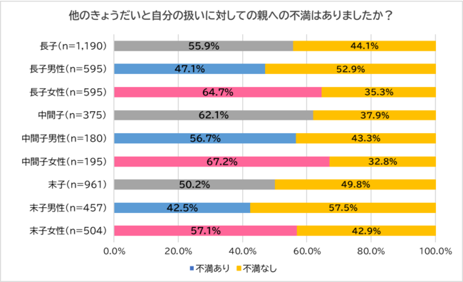 きょうだいのいる人に「他のきょうだいと自分の扱いに対しての親への不満はあるか」尋ねたところ、中間子女性は67.2%と最も「不満あり」が多い一方、末子男性は42.5%と最小でした。また、生まれ順に関係なく、全体的に男性よりも女性の方が親に対して不満があったことがわかりました。