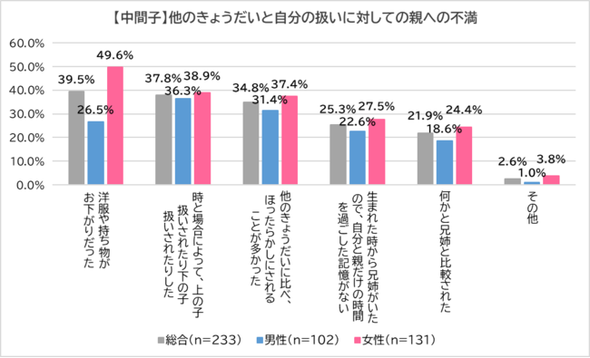 「男性より女性の方がどの生まれ順でも親に対する不満多い!」