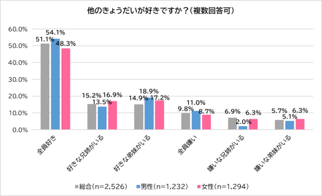 最後に、「他のきょうだいが好きか」尋ねました。約半数が「全員好き」(総合:51.1%、男性:54.1%、女性:48.3%)と回答しましたが、「全員嫌い」(総合:9.8%、男性:11.0%、女性:8.7%)も約1割いることもわかりました。