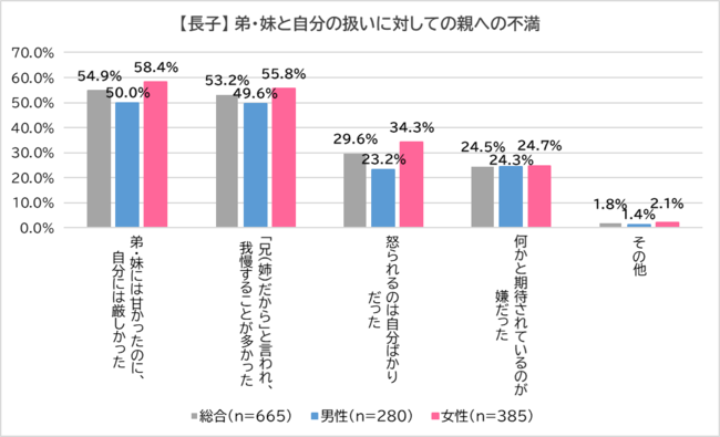 では、どのような不満があったのでしょうか?長子に尋ねたところ、半数以上が「弟・妹には甘かったのに、自分には厳しかった」(総合:54.9%、男性:50.0%、女性:58.4%)、「兄(姉)だから」と言われ、我慢することが多かった」(総合:53.2%、男性:49.6%、女性:55.8%)と回答しました。