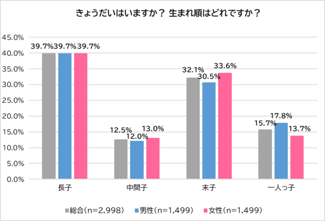 「きょうだいはいるか」尋ねました。長子39.7%(男性・女性ともに39.7%)、中間子12.5%(男性:12.0%、女性:13:0%)、末子32.1%(男性:30.5%、女性:33.6%)、一人っ子15.7%(男性:17.8%、女性:13.7%)となり、84.3%の人にきょうだいがいることがわかりました。