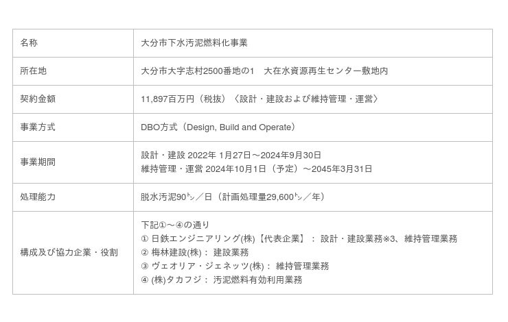 日鉄エンジニアリング株式会社(代表取締役社長:石倭行人、本社:東京都品川区、以下「当社」)を代表とする企業グループ※1は、このたび大分市上下水道局より「大分市下水汚泥燃料化事業」(以下「本事業」)を受注いたしました。