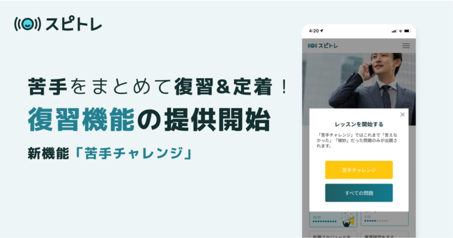 株式会社スピトレ(本社:東京都渋谷区、代表取締役社長 杉本 佳之、以下スピトレ)は、ビジネス英語の発話練習に特化したオンライン英語「スピトレ」にて苦手復習機能である「苦手チャレンジ」機能を実装いたしました。