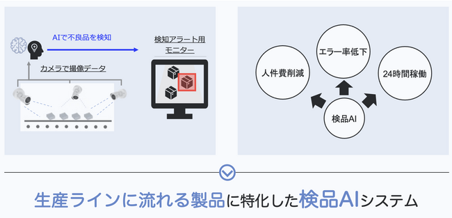 ・「迅速に」「高精度な」検品業務を行うことを可能にし、労働人口の減少や人手不足に起因する製造業の課題を解消します。人の目による誤検出を大幅に減少させることができるため、品質向上が期待できます。