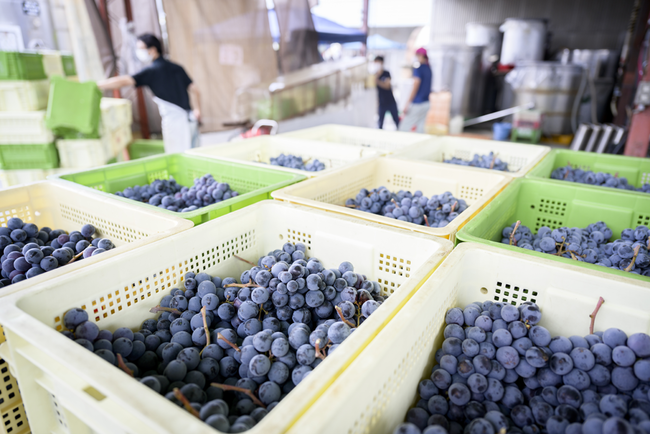 デラウェアの仕込みが8月上旬から始まり、アジロン・ダックが1週間後、そして9月頃から甲州とマスカット・ベーリーAがほぼ同時期に始まりました。甲州とマスカット・ベーリーAの収穫が年々早まってはいるものの、仕込みがほぼ同時期に始まり、同時期に終わるのは珍しいことです。春先までの天候は非常によく、期待はしていましたが、8月のまとまった長雨で糖度は期待値を下回ったものの、平年並みの収穫量となりました。糖度を上げることよりも健全果の収穫を優先し、pH、総酸の良い状態でワインを仕込みました。自社畑では甲州、マスカット・ベーリーA共に腐敗果の摘粒をしっかりと行い、良い状態で仕込みができました。また、契約農家さんの努力のおかげもあり、きれいな(質のいい)ぶどうを仕込むことができました。