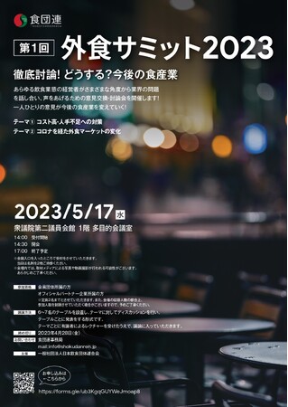 一般社団法人日本飲食団体連合会は、2023年5月17日(水)に、「第1回 外食サミット2023 ~どうする?今後の食産業~」を開催します。