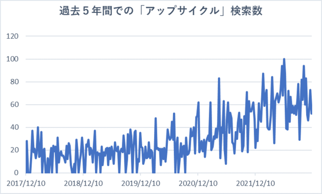 <参考>Googleでの「アップサイクル」検索数も直近5年で急伸しており、2022年は前年比1.54倍で検索数が増加しています。(データ:Googleトレンド)