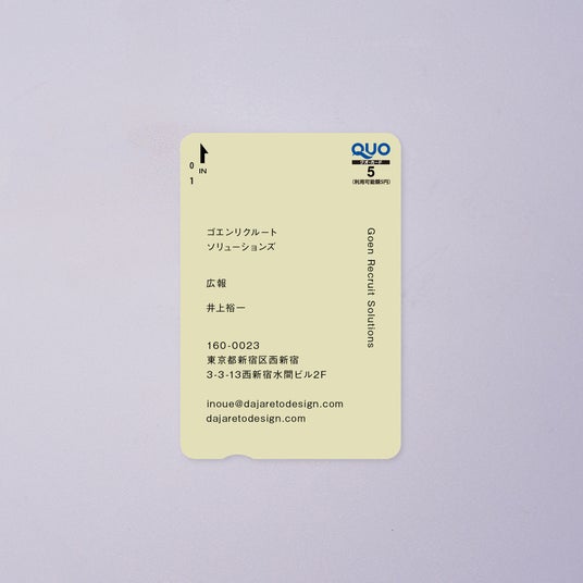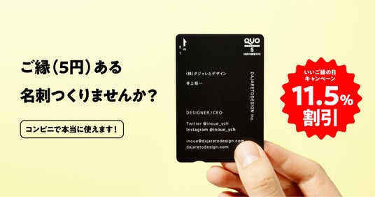 ご縁QUOカード名刺は、株式会社ダジャレとデザイン( 本社:東京都新宿区、代表取締役:井上裕一、以下「(株)ダジャレとデザイン」) が企画した、ご縁QUOカード名刺の受託制作サービスです。ダジャレから生まれた本サービスは、コンビニで本当に使える5円のQUOカード名刺で名刺交換を少し特別な記念にし、お会いできたご縁を深めます。この度は、本サービスにゆかりのある「いい(11 )ご(5 )えん」の縁結びの日(11月5 日)より、同じく語呂が「いいごえん」の1月15日までの期間、デザイン制作費が「いいごえん」となる11.5%割引キャンペーンを開催します。