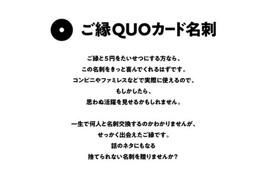オンラインの時代だからこそ、リアルで会う人の存在は尊い。ご縁QUOカード名刺を渡せば、名刺交換の場があったまるかもしれません。