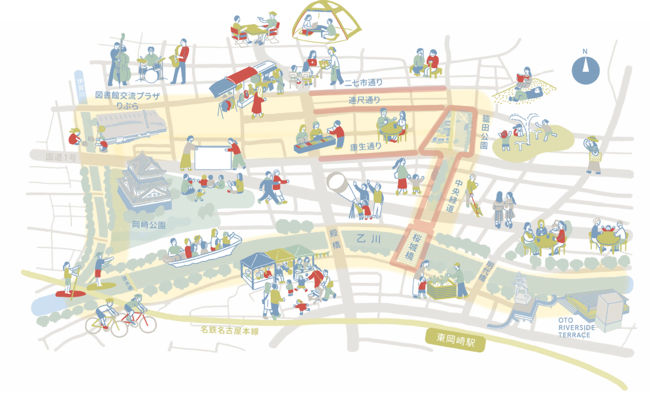 乙川リバーフロント地区の豊富な公共空間を活用して、パブリックマインドを持つ民間を引き込む公民連携プロジェクトを実施することにより、回遊を実現させ、 波及効果として、まちの活性化(暮らしの質・エリアの価値向上)を図る戦略