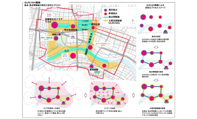 岡崎市では、QURUWAの回遊性を高め、「暮らしの質」と「エリアの価値」の向上を図る「QURUWA戦略」に取り組んでいる。