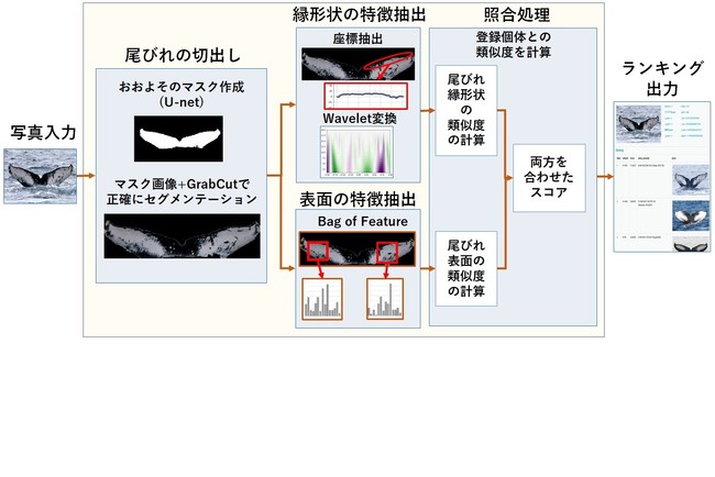 ザトウクジラは、尾びれ腹側の模様や形状を利用して個体を識別できることが知られている。今回、株式会社Diagenceと大阪大学サイバーメディアセンターと慶應義塾大学は一般財団法人沖縄美ら島財団が30年以上にわたり収集してきた1850頭、約1万枚のザトウクジラの尾びれの写真を用いてクジラの個体を自動で識別できるAI技術および自動識別システムを開発した。本研究では、ザトウクジラの研究者の個体識別に関する知見を活用してAIアルゴリズム・システムを開発することで、撮影された尾びれの写真を入力すると、登録されている1850頭のクジラの尾びれの中から特徴が近い尾びれを有するクジラを順番にリストアップすることに成功した。すでに登録されているクジラであれば約89%が30頭内に正解個体がリストアップされ、約76%は正解個体が1位としてリストアップされた。
