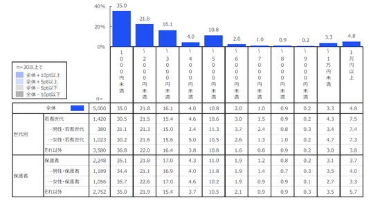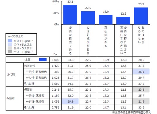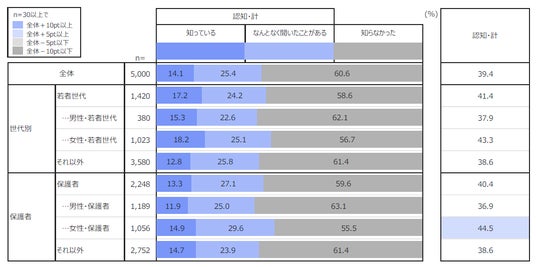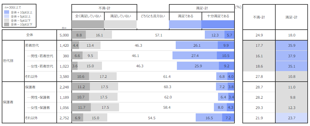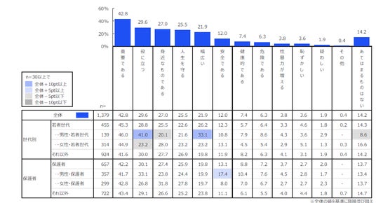 更に、若者世代(15歳~24歳)、保護者(子ども有)に分けて全体との比較分析を行いました。