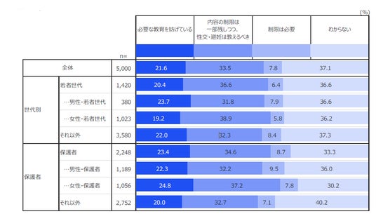 学習指導要領における「はどめ規定」(※1)についての認知率は18.8%にとどまった一方で、「必要な教育を妨げている」(21.6%)と「制限は一部残しつつ、性交・避妊は教えるべき」(33.5%)を合わせると過半数がより踏み込んだ教育を求めており、「制限が必要」と答えたのは7.8%でした。